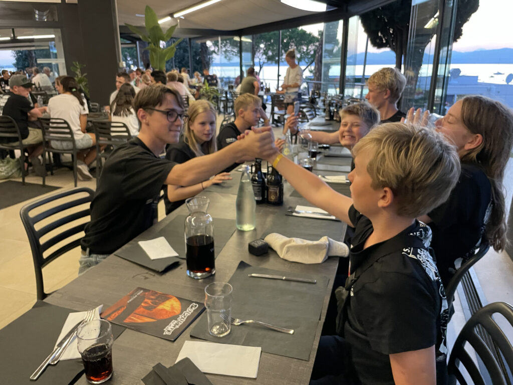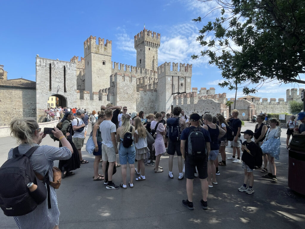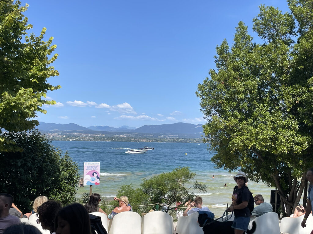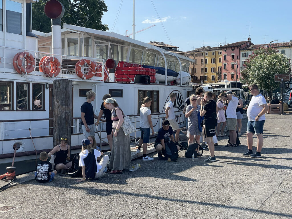 Kl. 14:00: Vi skulle mødes ved færgen tilbage til Peschiera. Den kom ikke. Først skulle vi stå og grille i solen, mens TO andre færger legede “vi skal også lige lægge til kaj”. 40 minutter og ét smeltet isbjerg senere, kom vi endelig afsted mod campingpladsen. Eftermiddagen blev brugt i poolen, i skyggen eller med at pakke tasker til aftenens højdepunkt: Koncert med et ægte italiensk ungdomsorkester i Pacengo.