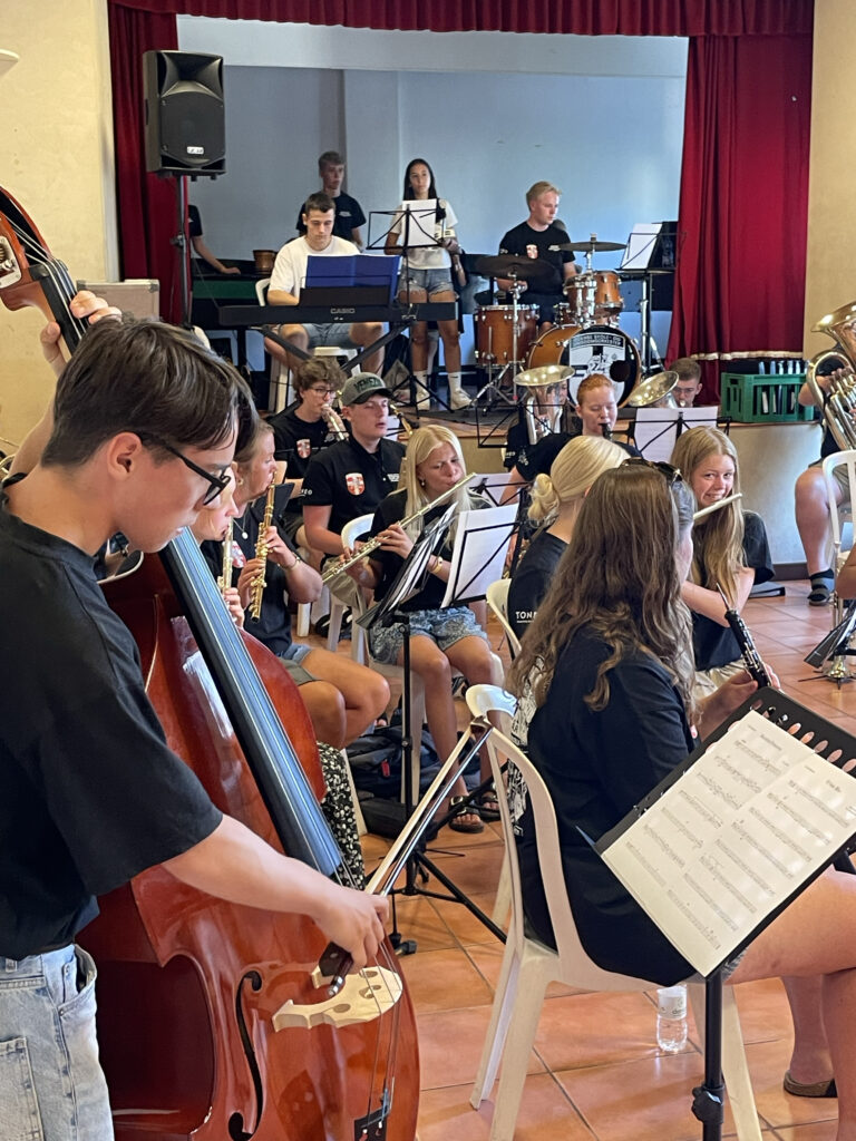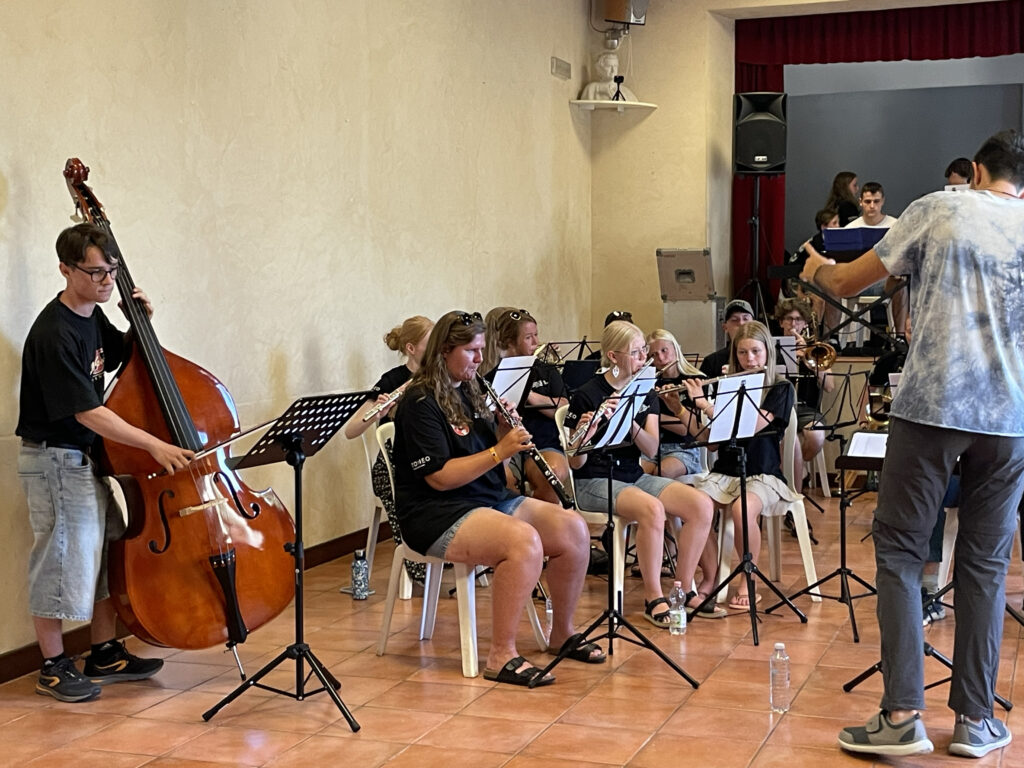 Vi ankommer til et hyggeligt lokale, og orkestrets medlemmer byder os velkommen Vi havde nogle timer forinden fået at vide at det vi skulle spille var altså noder vi ville få direkte til øveren, til stor begejstring for mange af eleverne. Efter at have slæbt vores instrumenter op ad cirka en million trapper, gik øveren i gang. Det gik faktisk overraskende godt, på trods af konstant italiensk sladder fra orkestrets teenagere (det er vi jo slet ikke vant til, vel? hihihi).